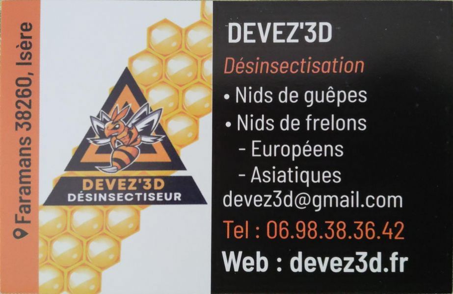 DEVEZ'3D Désinsectiseur nids de guêpes et frelons DEVEZE Anthony -- 38260 Faramans 06 98 38 36 42 Contactez-nous Visitez le site web |